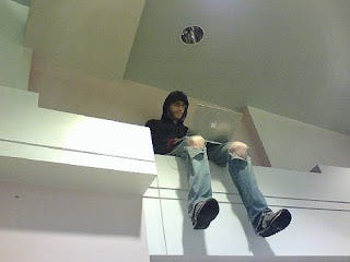 [The above picture is a photo of a sculpture found in the University of Cincinnati's College of Design, Architecture, Art, and Planning (DAAP) building. When I first walked through the building, I thought, "Dang, how'd he get up there?" then instantly realized that, "Duh, he's not real."]