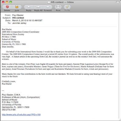 I thought my Emoticons had a chance, but c'est la vie. I think my horn quartet is a pretty decent piece, although I recently realized I've only had it performed twice. Should I have it performed again in April for the MTMS Conference, or should I go with How to be a Deep Thinker in Los Angeles?
