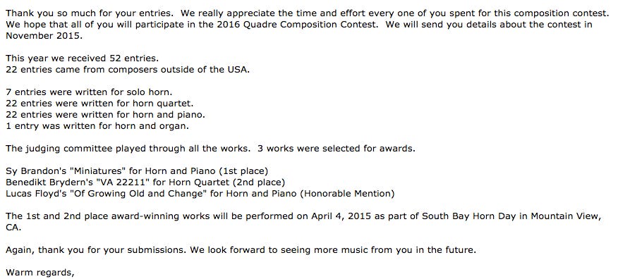 This rejection is fresh out of my inbox since this past week has been absolutely crushing (this rejection did not help), and well, Hope Springs Eternal, especially when your composer friends decide to do something…incendiary.