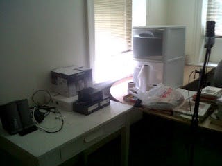 Apologies for not posting in a while: I am in the processes of loading all my books and a few personal items into cardboard boxes and dumping them into my new office, which needs some serious interior design work, as you can see in this photo.